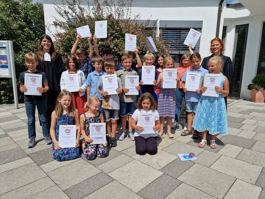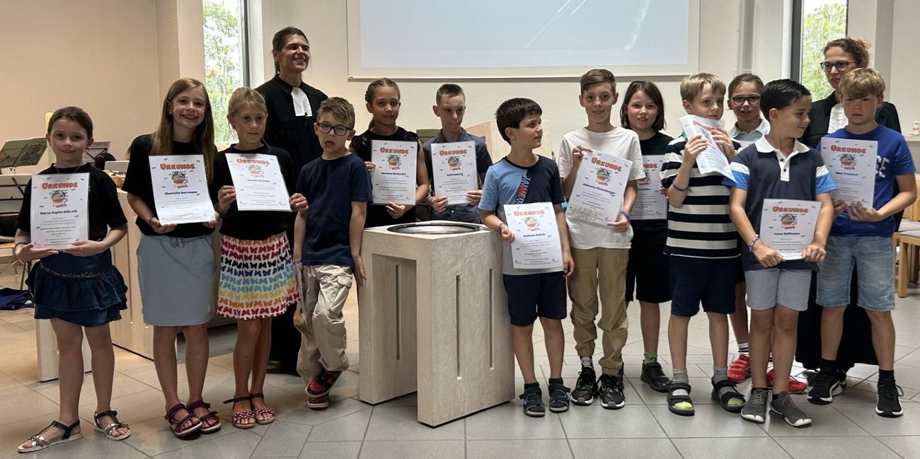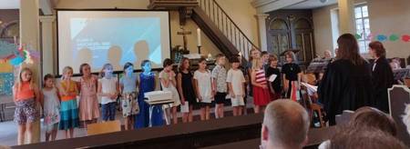 Am Sonntag, dem 14. Juli, feierten unsere Konfi 3 Kinder ihren Segensgottesdienst. Emil wurde sogar getauft. So konnten alle Konfi 3 Kinder bei einer echten Taufe dabei sein. Zuvor durften sie ja schon ihre Puppen und Kuscheltiere taufen. Vieles haben die Kinder für den Gottesdienst selbst vorbereitet: Einen Bericht über die Konfi 3 Zeit geschrieben, Gebete verfasst, eine Bibelgeschichte mit Playmobil-Figuren nachgestellt. Highlight des Gottesdienstes war der Segen und die Übergabe der Urkunde. Im Anschluss blieben alle noch bei Kaffee und sehr leckerem Kuchen beisammen. Es war mal wieder eine gelungene, erfüllte Zeit mit den evangelischen Drittklässlern. Im kommenden Jahr geht es wieder los. Pfarrerin Eva Leonhardt und ich freuen uns schon auf die nächste Gruppe.