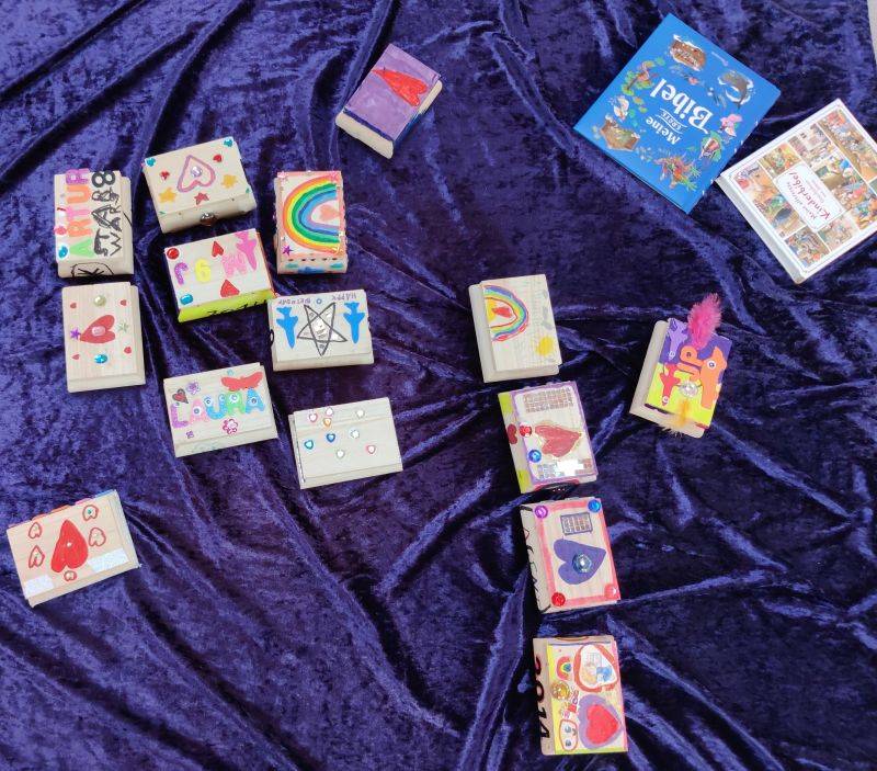 Für jedes Konfi-3-Kind ein rotes Herz mit der himmlischen Botschaft: Jesus sagt: „Du bist wichtig für mich!“ Diese Liebeserklärung braucht einen schönen Aufbewahrungsplatz. Also wurden wunderschöne Schatzkisten gestaltet. Viel Freude damit!